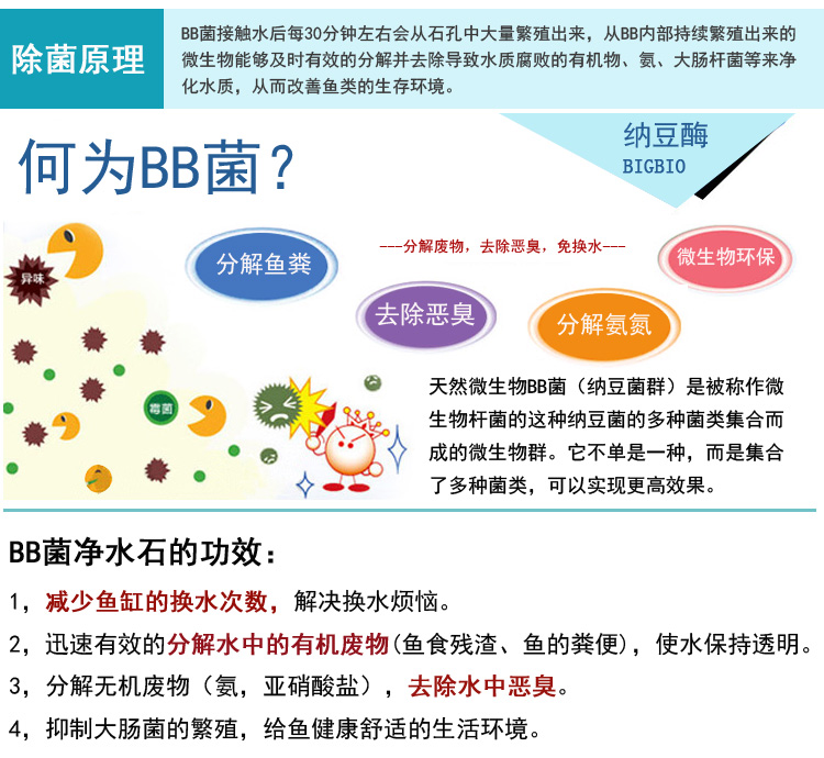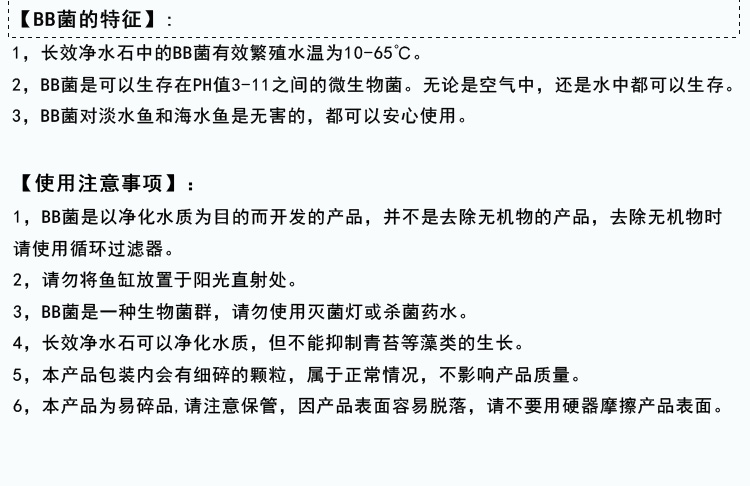 【溫馨提示】:BB菌凈水石安全環保,長效免維護。使用前要先浸泡24小時,再放入魚缸中。微生物產品見效比化學藥劑要慢一些,短至一周,長至數周。性急的魚友慎拍!如果魚缸密度大,又不使用過濾器的,請慎用! 由于養魚習慣及養魚的環境不同,所達到的效果不同,使用時間長短不同。請保持良好的養魚環境。