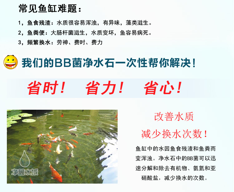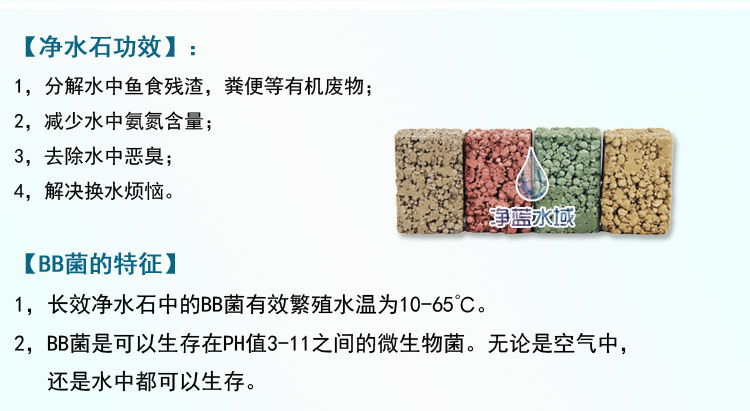 1,長效凈水石中的BB菌有效繁殖水溫為10-65℃。