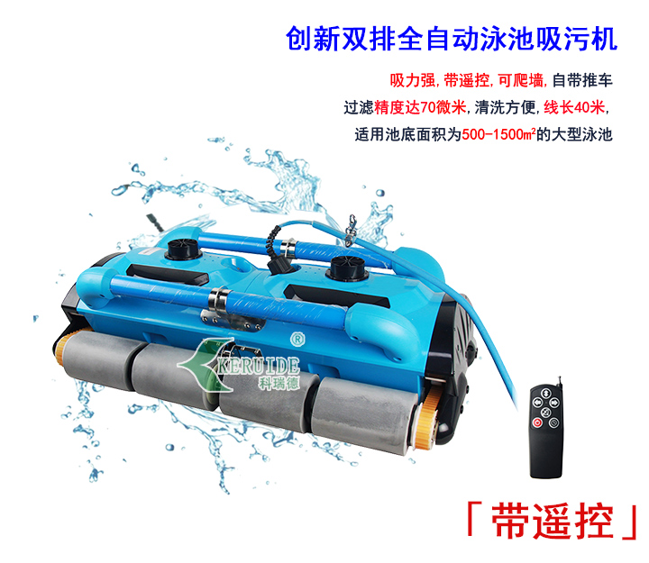 另外,本雙排吸污機帶有無線遙控器,方便控制吸污機的清洗區域。這一功能尤其適用于泳池的局部清潔及定點清潔,使泳池清潔工作更加方便,省時省力哦。
