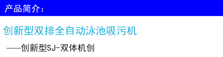 創新型SJ-雙體機,電纜線長40米,與帝鯊吸污機的線長相同,可清洗大中型泳池,標準池等。清洗時無須工作人員在場也能自己工作,清掃、洗刷、過濾。其使用方便,適用于各類游泳館、體育館、酒店泳池、學校泳池、小區泳池、訓練池等。