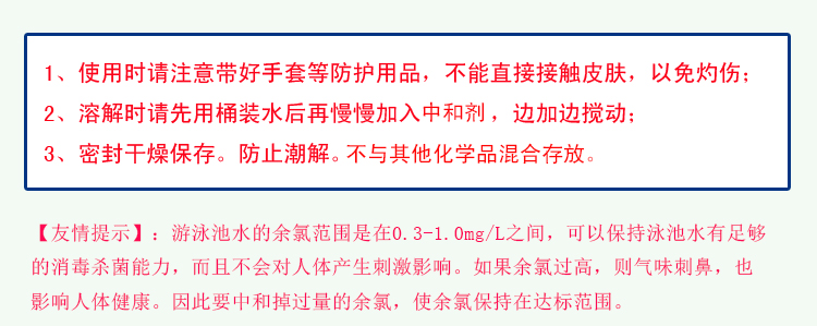 2)使用游泳池氯中和劑時佩戴橡膠手套、保護眼鏡或面罩,避免接觸皮膚、眼睛或衣服。如不慎接觸請用水沖洗10分鐘左右,如有不適請求醫。若誤吞服,請大量飲水并馬上求醫。