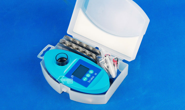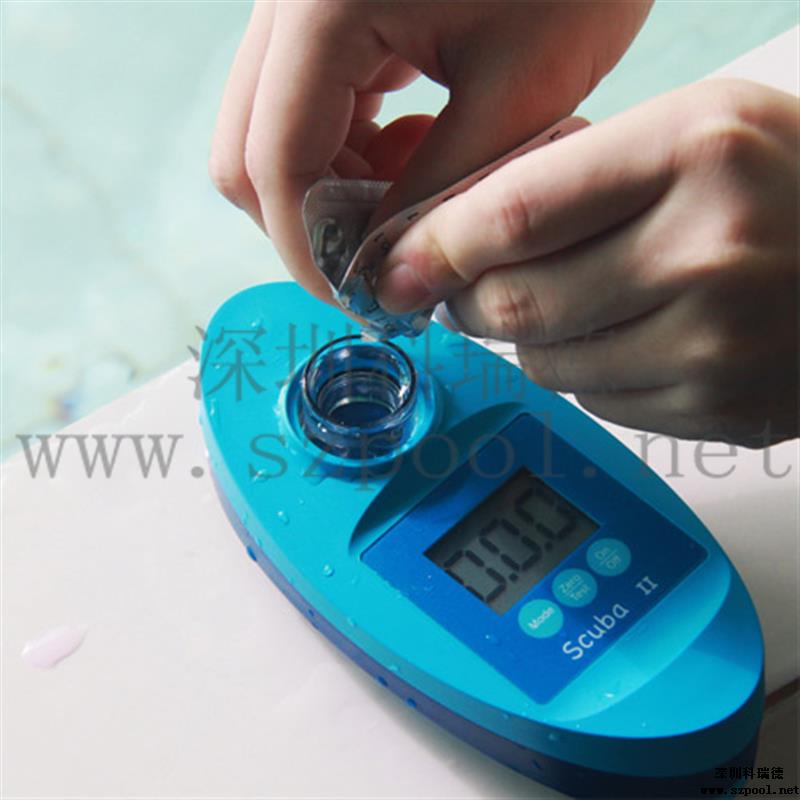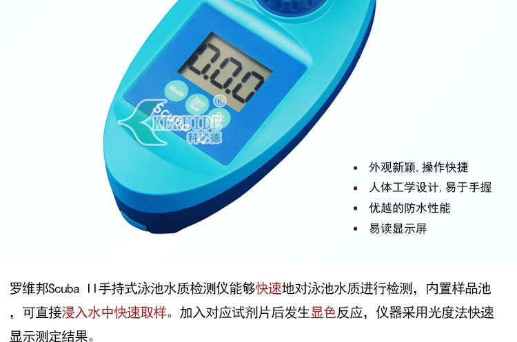 羅維邦ScubaII手持式泳池水質檢測儀能夠快速地對泳池水質進行檢測,內置樣品池,可直接浸入水中快速取樣。加入對應試劑片后發生顯色反應,儀器采用光度法快速顯示測定結果。