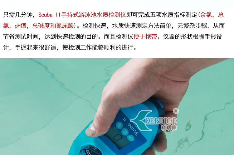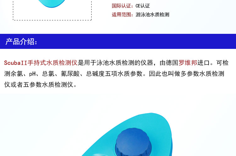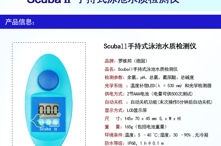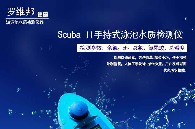 Scuba II手持式泳池水質檢測儀是用于泳池水質檢測的儀器,由德國羅維邦進口??蓹z測余氯、pH、總氯、氰尿酸、總堿度五項水質參數。因此也叫做多參數水質檢測儀或者五參數水質檢測儀。