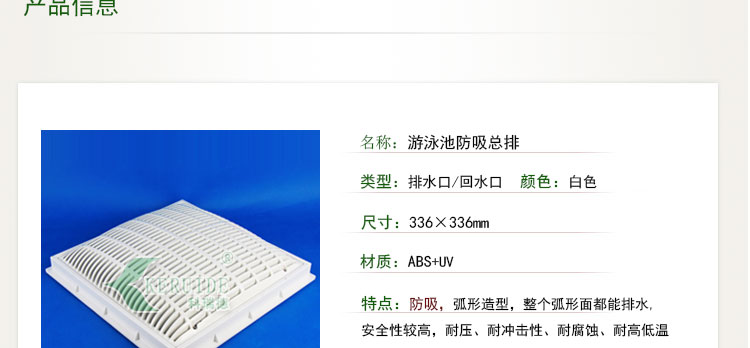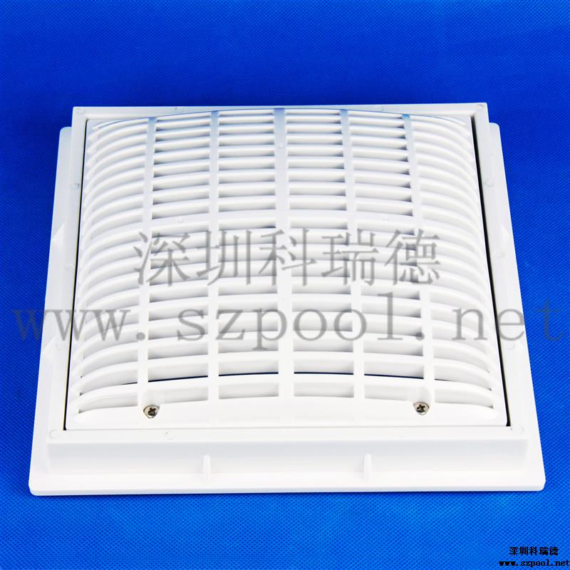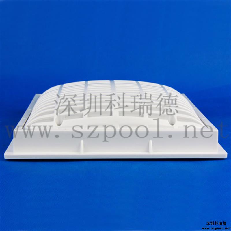 游泳池防吸回水口是為了泳池防吸,減少游泳隱患專門設計的游泳池防吸排水口,防吸總排,防吸入底排。防吸回水口表面為弧形設計,如果人體落入底排上,四周還可以流水,防止人被吸入的作用。