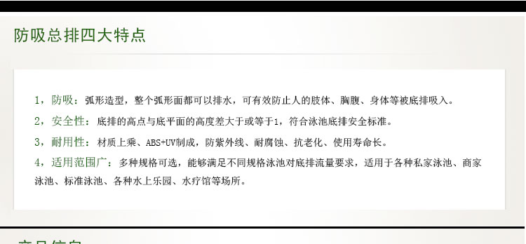 4、多種規格可選,能夠滿足不同規格泳池對底排流量要求,適用于各種私家泳池、商家泳池、標準泳池、各種水上樂園、水療館等場所。