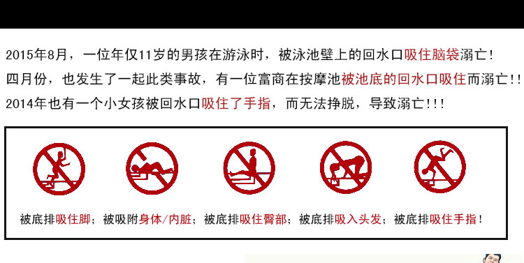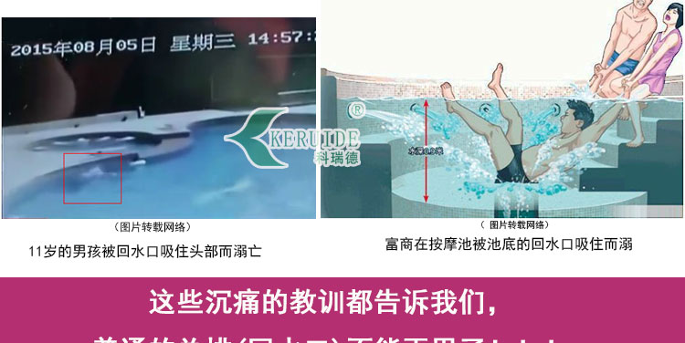 傳統的游泳池排水口表面為平面,排水時水流從同一個平面排水,造成的吸力非常大,容易發生險情。然而現在有了防吸回水口,能有效避免回水口吸人了的隱患。