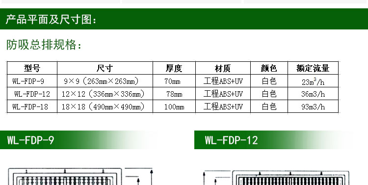 WL-FDP-9? 尺寸;9×9(263mm×263mm)?? 厚度:70mm?? 材質:工程ABS+UV? 顏色:白色? 額定流量:23m3/h