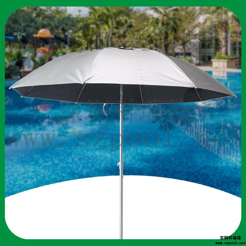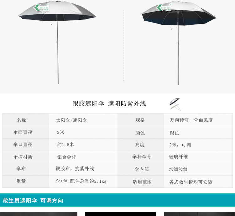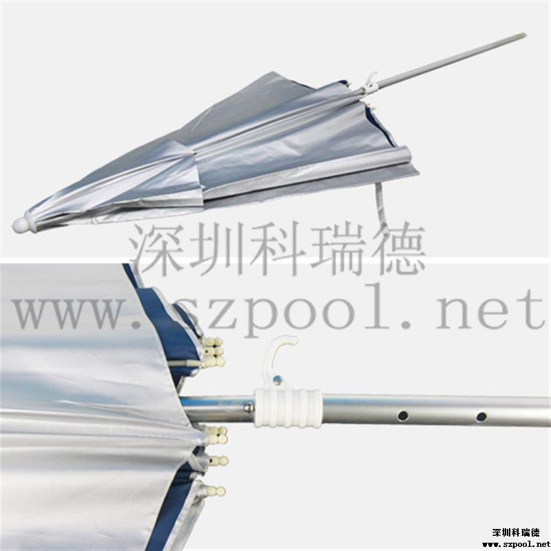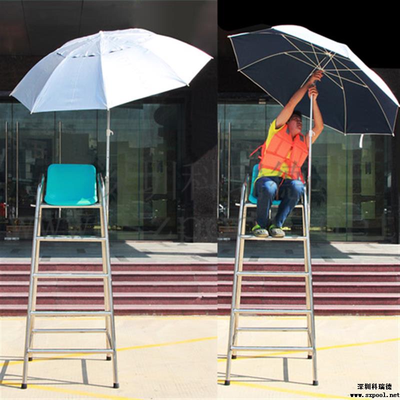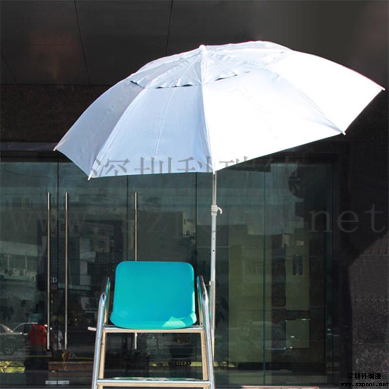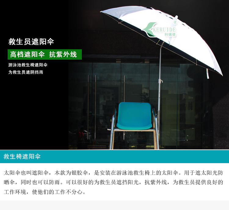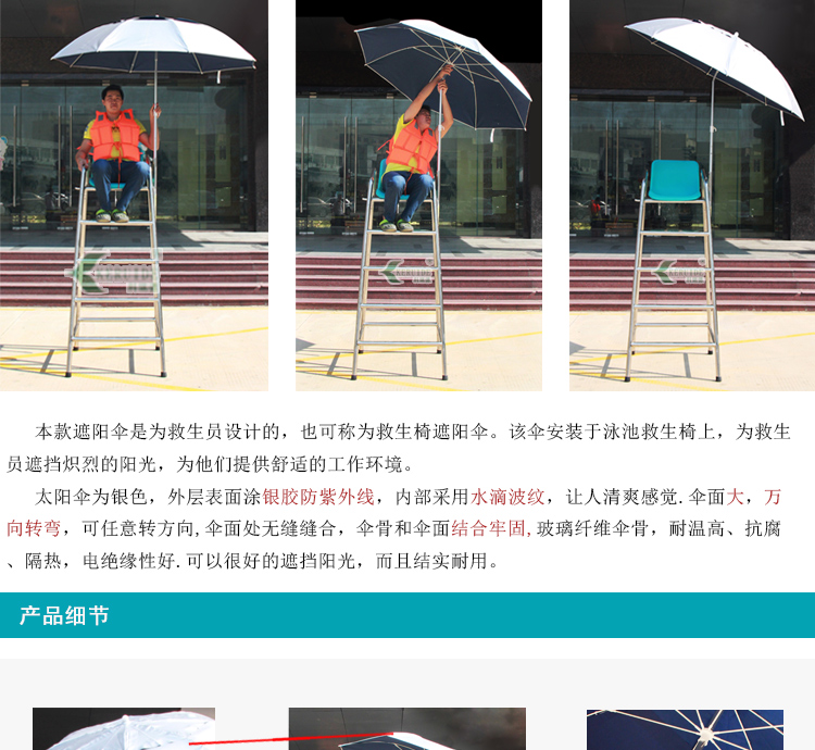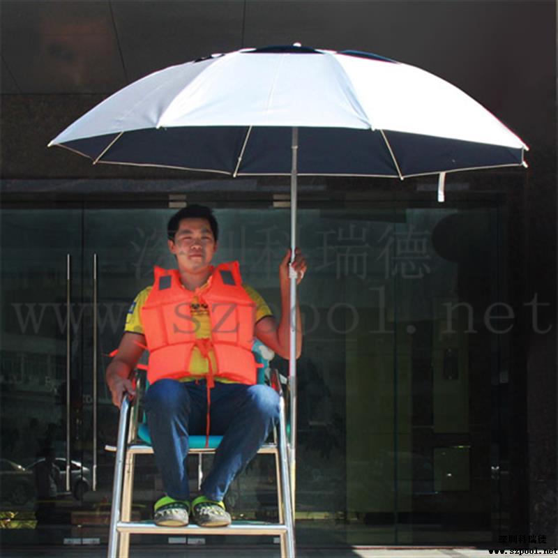 救生員遮陽傘也叫救生椅太陽傘,是安裝在游泳池救生椅上,為救生員遮擋陽光的傘,同時也可以防雨。本款太陽傘采用210D滌絲銀膠布,拒水pu涂層可防雨。外部的銀膠涂層可效抵擋陽光中的紫外線,內部采用水滴波紋,為深色,可以避免地面反射的UVA至臉部。而且傘面積大,為萬向傘,可以任意角度調節。傘柄的高度也可以調整。