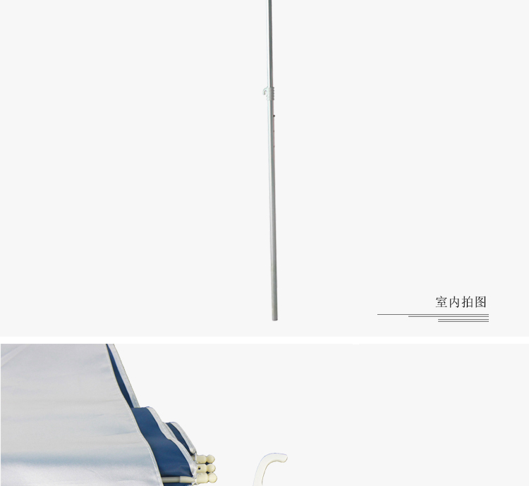 傘桿:上桿采用直徑22mm的鋁合金管,下桿采用直徑19mm的鋁合金管。上桿中部有一個萬向轉向,可使傘頭向任意方向角度彎折。