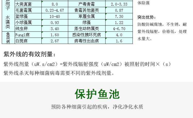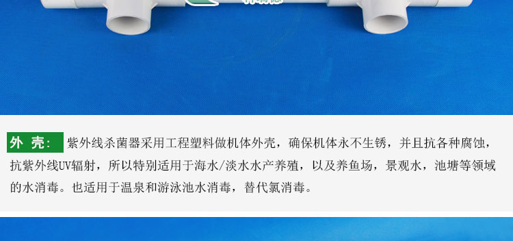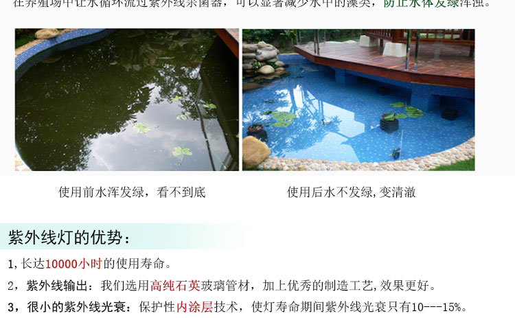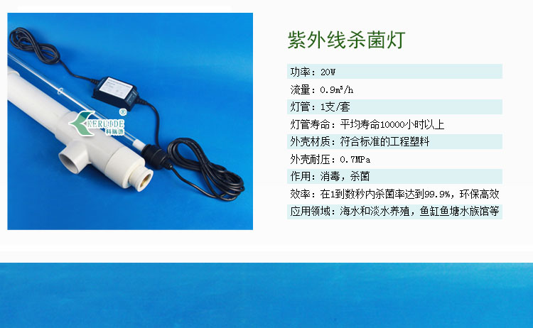 此魚池紫外線殺菌燈的功率為20w,流量為0.9立方/小時,環保高效。此款為小功率的魚池紫外線殺菌燈。可以根據用戶要求定制特殊規格產品,具體可按每小時循環水量來配套相應的規格??梢詽M足各種大小水體的水殺菌要求,為各種水體殺菌提供解決方案。適用于凈化海水和淡水養殖,魚缸、魚塘、水族館,游泳池、溫泉、景觀水體等。