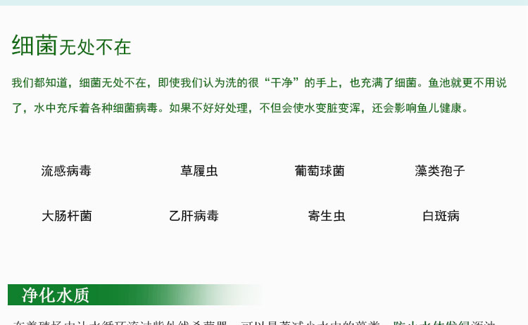 魚池紫外線殺菌燈,也叫紫外線消毒器,是專門用于魚池殺菌的設備,可以消除魚池水中的各種細菌、病毒、孢子等。還可以顯著減少水中的藻類,并殺滅引起魚類疾病的寄生蟲,維持魚池水質健康衛生,促進魚類健康生長。
