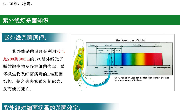 紫外線殺菌原理是利用波長是200到300nm的UVC紫外線光子照射微生物及各種細菌病毒,破壞微生物及細菌病毒的DNA基因結構,使之失去繁殖復制能力,從而使其死亡。紫外線UVC可以在一到數秒內殺死空氣中和水中大部分細菌病毒及其他微生物,尤為可貴的是紫外線可以殺死一些常規化學方法如加氯難以殺死的病毒。和其他殺菌方法例如化學制劑消毒相比,利用UVC紫外輻射殺菌是經濟環保的殺菌方法。