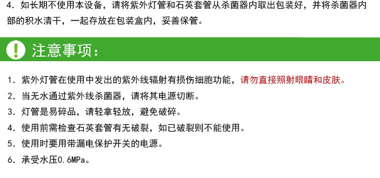 4.如長期不使用本設備,請將紫外燈管和石英套管從殺菌器內取出包裝好,并將殺菌器內部的積水清干,一起存放在包裝盒內,妥善保管。