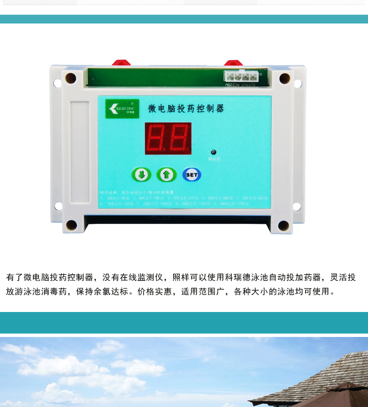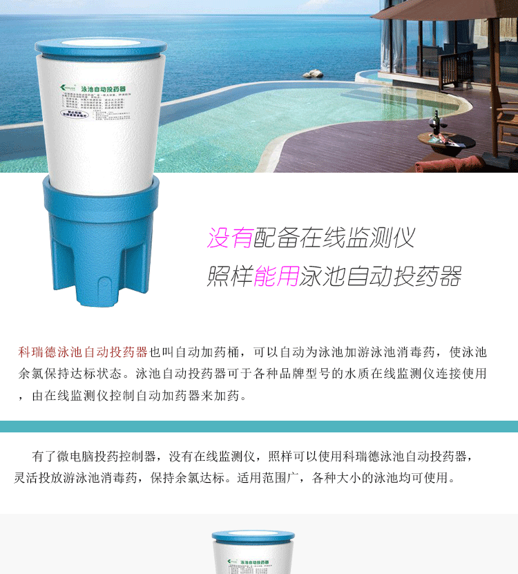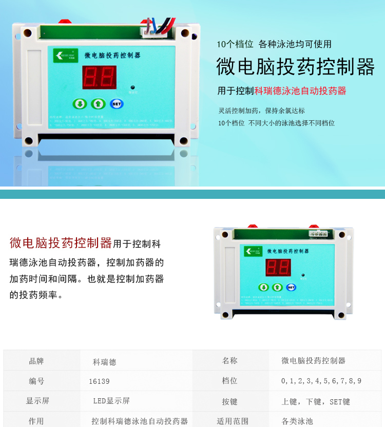 科瑞德微電腦投藥控制器可控制投放泳池消毒劑,也可控制投放泳池pH調節劑,一個控制器控制投放一種藥劑。