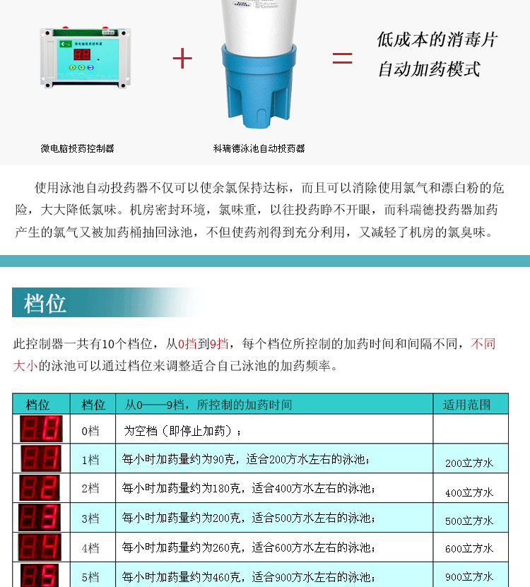 具體檔位說明(加藥量是以科瑞德?泳池自動投藥器來衡量):