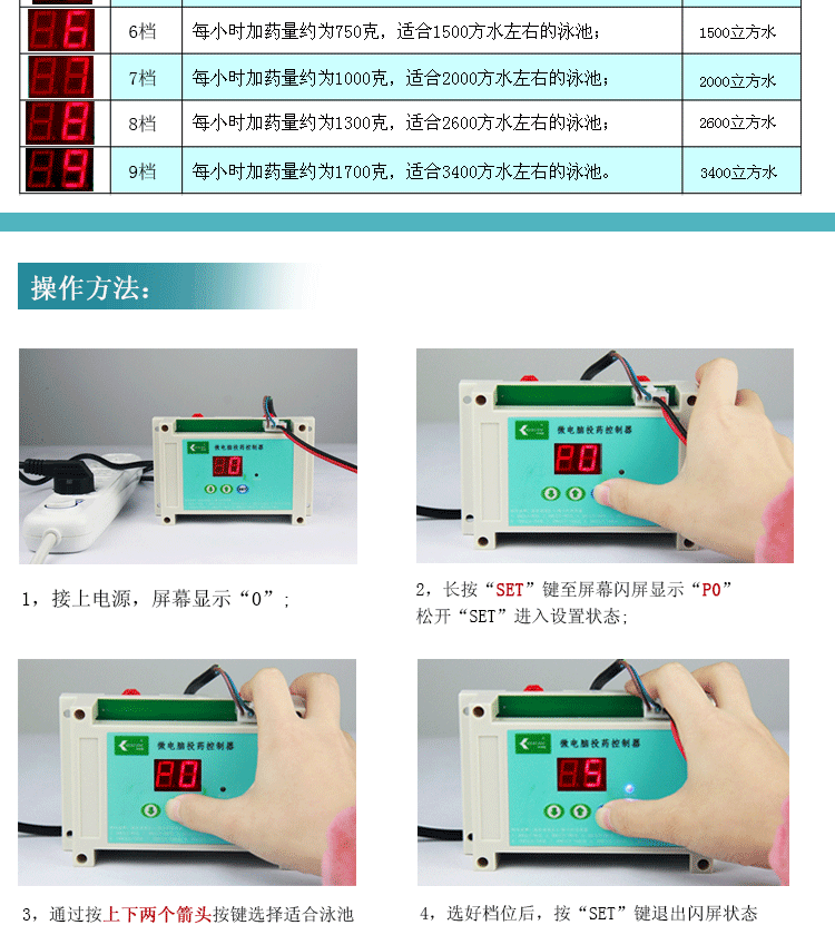9檔:每小時加藥量約為1700克,適合3400方水左右的泳池。