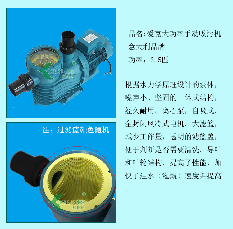 它的吸污泵為3.5匹愛克吸污泵,吸力足,吸污快。配備70x35cm的不銹鋼吸污盤,此吸污盤比一般的吸污頭幾乎要大一倍,并且有四個吸污進水口。它的吸污面積大,吸力強,與大功率吸污泵搭配,提高了吸污的效率(普通吸污盤壓不住這么強的吸力,很容易與吸污管脫離甚至浮上水面)。