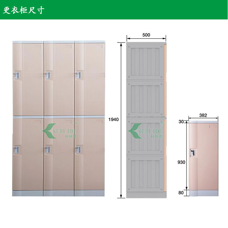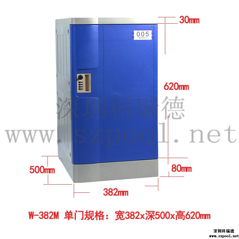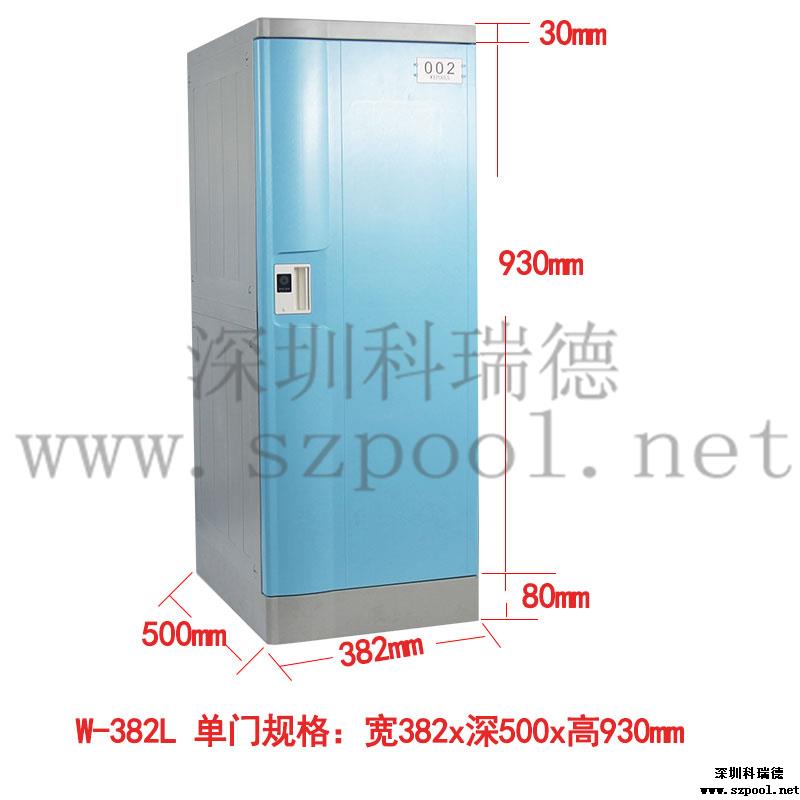 Wepools塑料更衣柜382系列的寬度382mm,深度是500mm,門板為簡單大氣的寬弧形,區別于其他系列,上下板厚30mm,底座高達80mm使產品更牢固結實耐用,加高底座方便底部柜子使用,防止水花濺入。