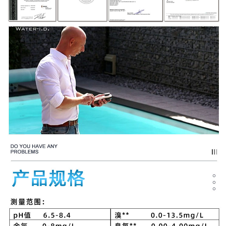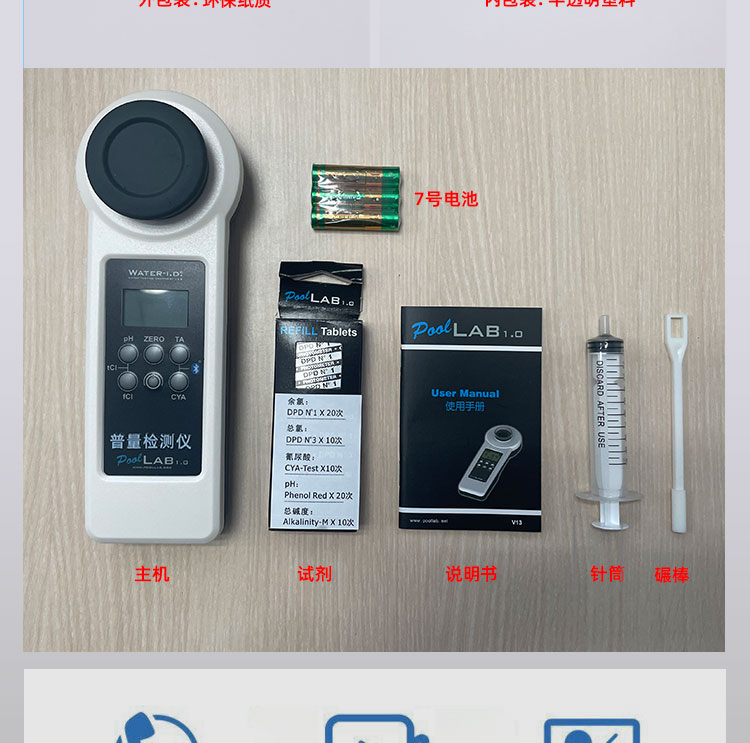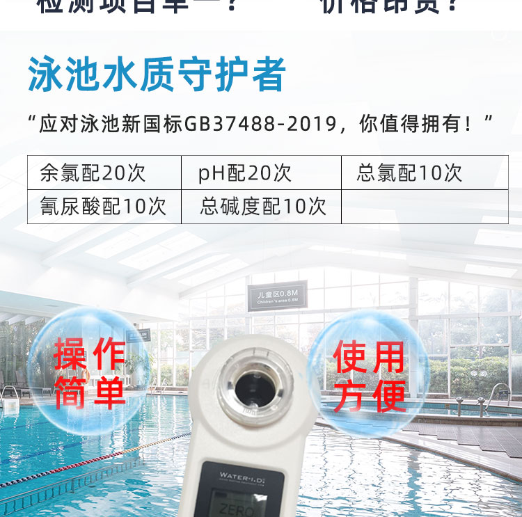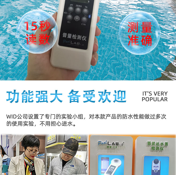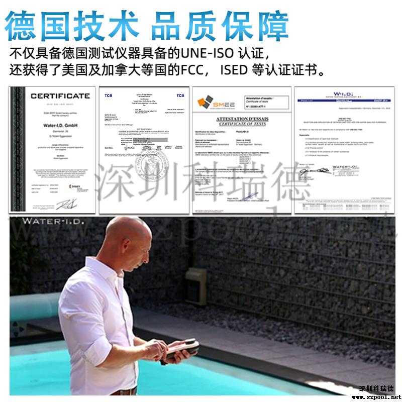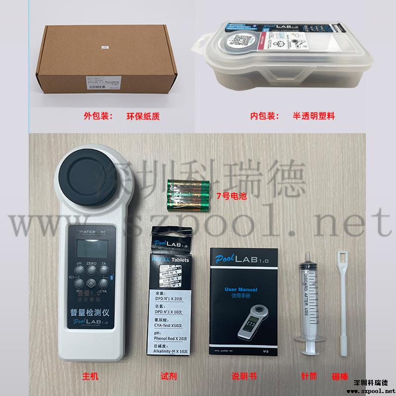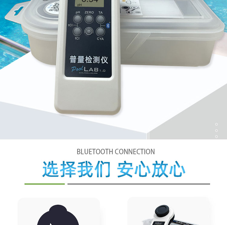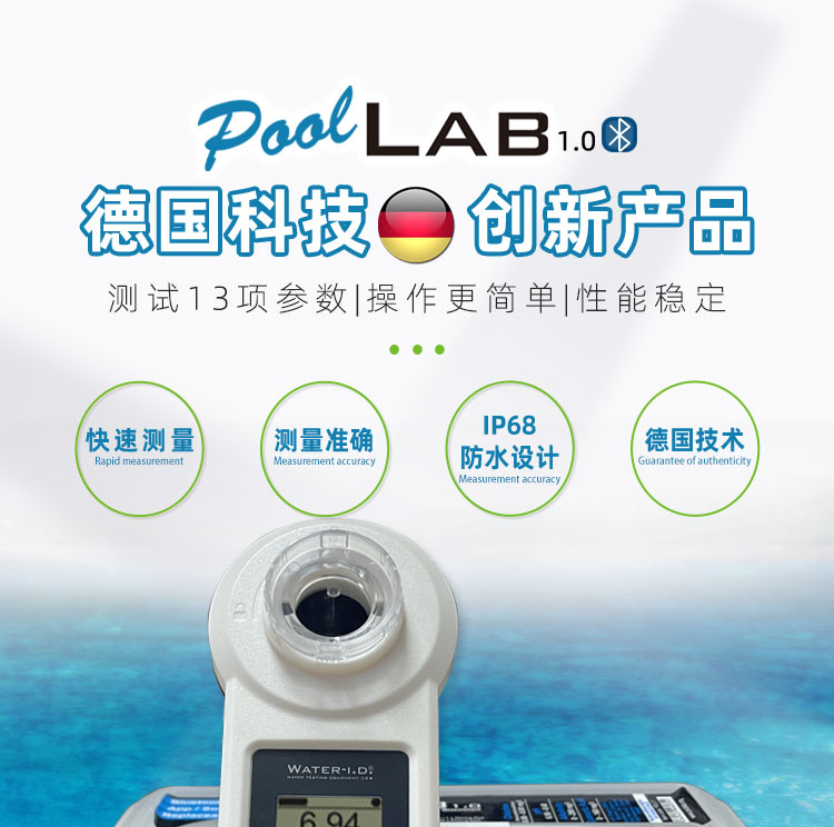 PoolLAB/普量水質檢測儀是用于各類游泳池水質檢測使用的儀器,它能檢測池水中:余氯/pH/氰尿酸/總堿度/結合性余氯/鈣硬度等13個項目指標,能快速檢測,得出結果,使用簡單、易懂、性能可靠等特點,本款游泳池水質檢測儀擁有IP68防水級別,在使用的過程不慎掉入水中或涉水不用擔心進水,使用壽命長且經濟實惠,應對國標GB37488-2019水質項目檢測,每個游泳場所適合選擇。