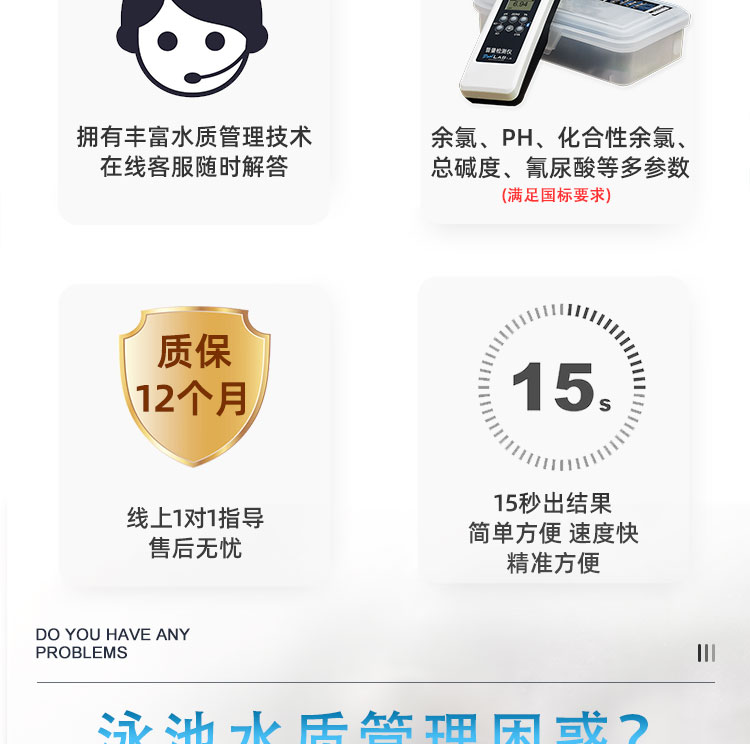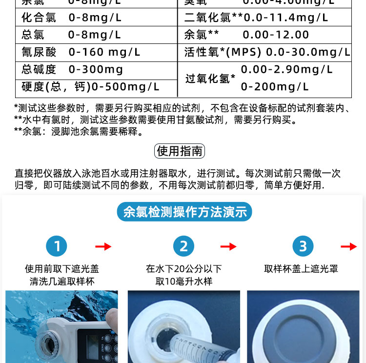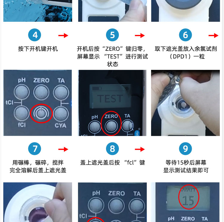 4. 如需測池水中的:余氯/氰尿酸,可以先加入余氯試劑,用碾棒碾碎溶解均勻,無殘留,蓋上遮光罩,按“fcl”鍵,等待15s,顯示測試結果后,清洗取樣槽,再次取水樣,加入氰尿酸試劑,碾碎溶解均勻,按“CYA”鍵,等待15s,顯示測試結果。(如果還想連續測試其它的指標,清洗取樣槽,重新取水樣,加入想測的試劑即可檢測了)以此類推!