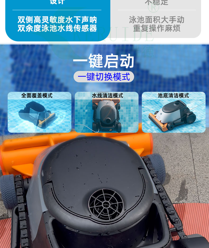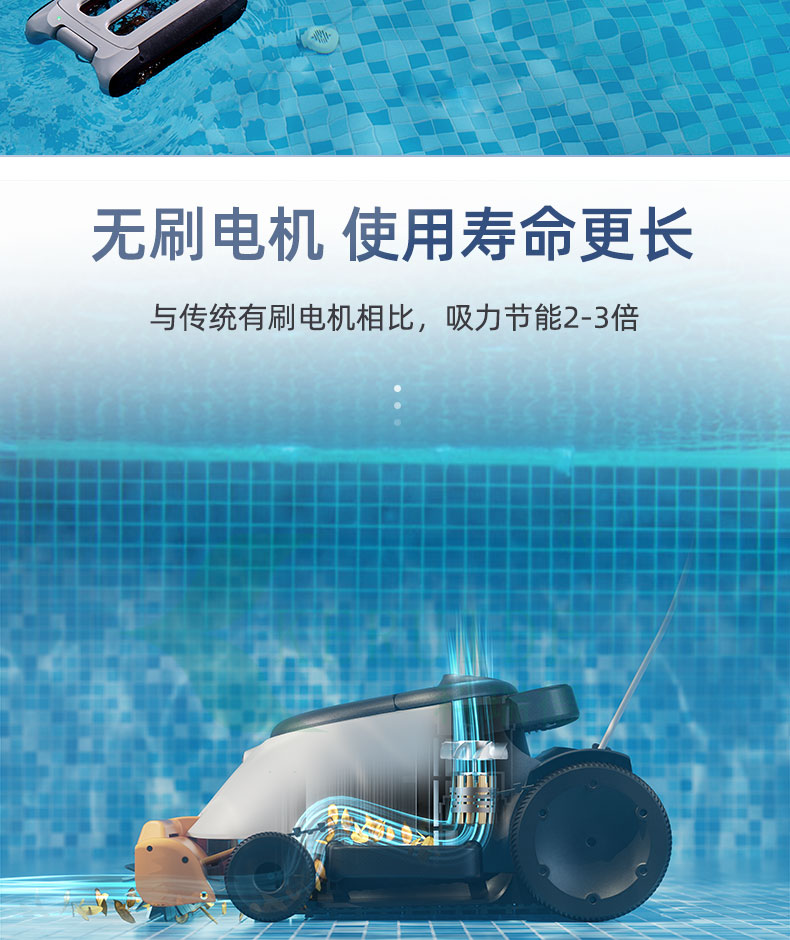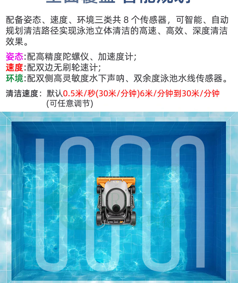 智能規劃清潔路徑,無需人工干預,可以有序的在泳池清潔,無線設計,大大提高清潔效率,