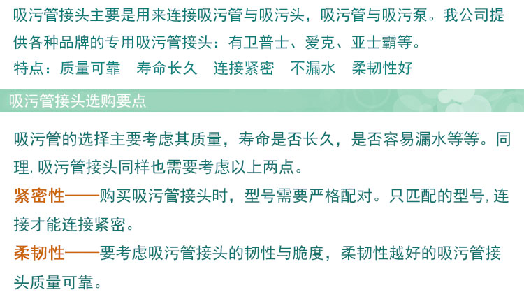 選購要點:吸污管的選擇主要考慮其質量,壽命是否長久,是否容易漏水等等。同理,吸污管接頭同樣也需要考慮以上兩點。