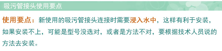 使用要點:新使用的吸污管接頭連接時需要浸入水中,這樣有利于安裝,如果安裝不上,可能是型號沒選對,或者是方法不對,要根據技術人員說的方法去安裝。