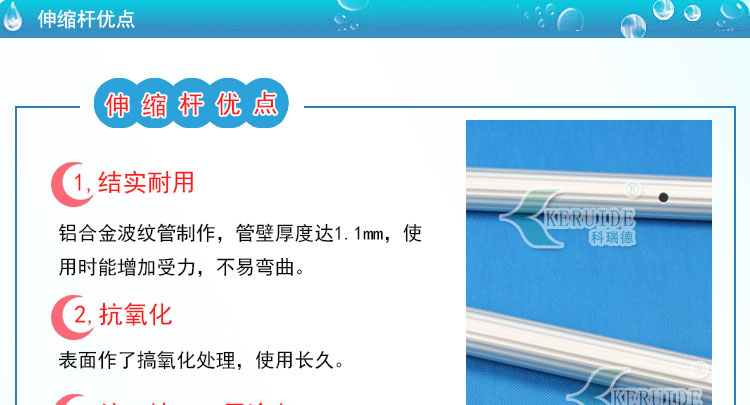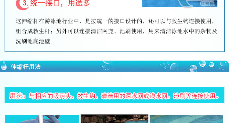 游泳池伸縮桿屬于游泳池吸污用品的一種配件。簡稱伸縮桿,因為主要作用是手動吸污機的操作桿,所以也叫吸污機伸縮桿,同時可以與救生鉤連接使用,所以也叫救生桿等。本產品使用優質的PVC制作,質量可靠,人性化設計,不打滑,大小也正合適,是一款性價高泳池配件。