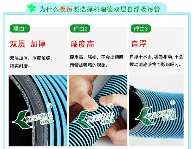 游泳池吸污管:是游泳池吸污機的配件,用于連接水泵和吸污頭,本吸污管為雙層自浮塑料軟管,也叫游泳池吸污喉。
