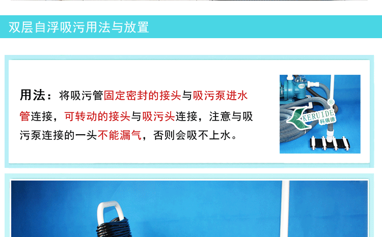 吸污管的兩端的各有白色接頭一個,固定密封的是與吸污泵連接的,可轉動的是與吸污頭連接的。吸污時吸污管能夠上浮于水面上,有效防止由于移動而攪動池底的細小臟物影響吸污效果。