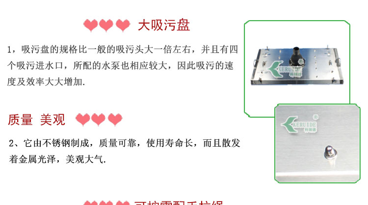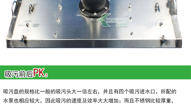 吸污盤的規格比一般的吸污頭大一倍左右,并且有四個吸污進水口,所配的水泵也相應較大,因此吸污的速度及效率大大增加;