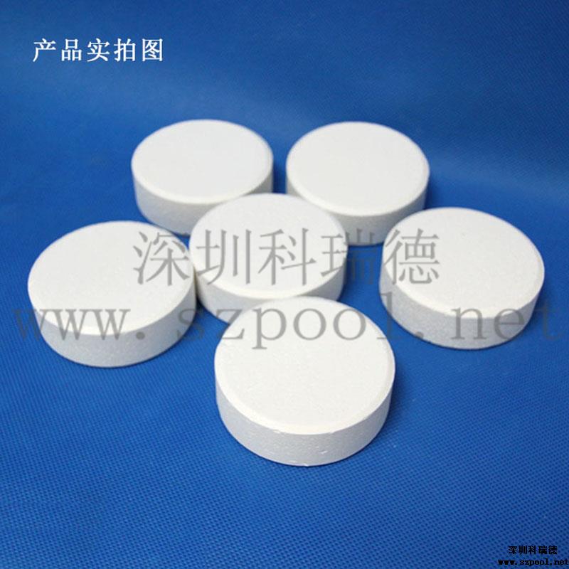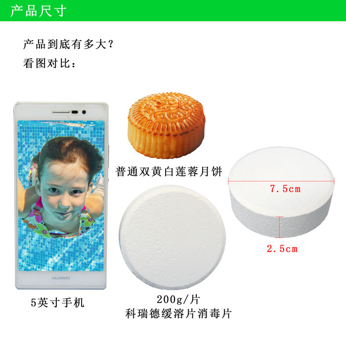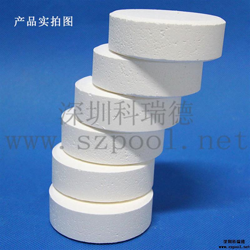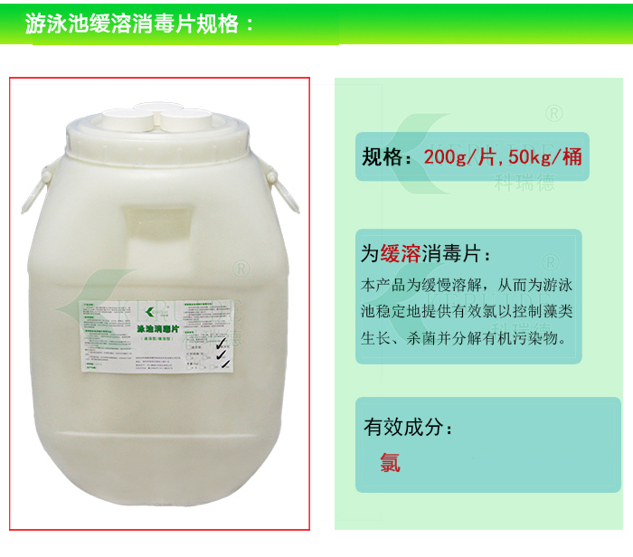 【包裝規格】:200g/片,50kg/桶。為緩溶消毒片。(因為藥片比較大,也叫大片游泳池消毒片)