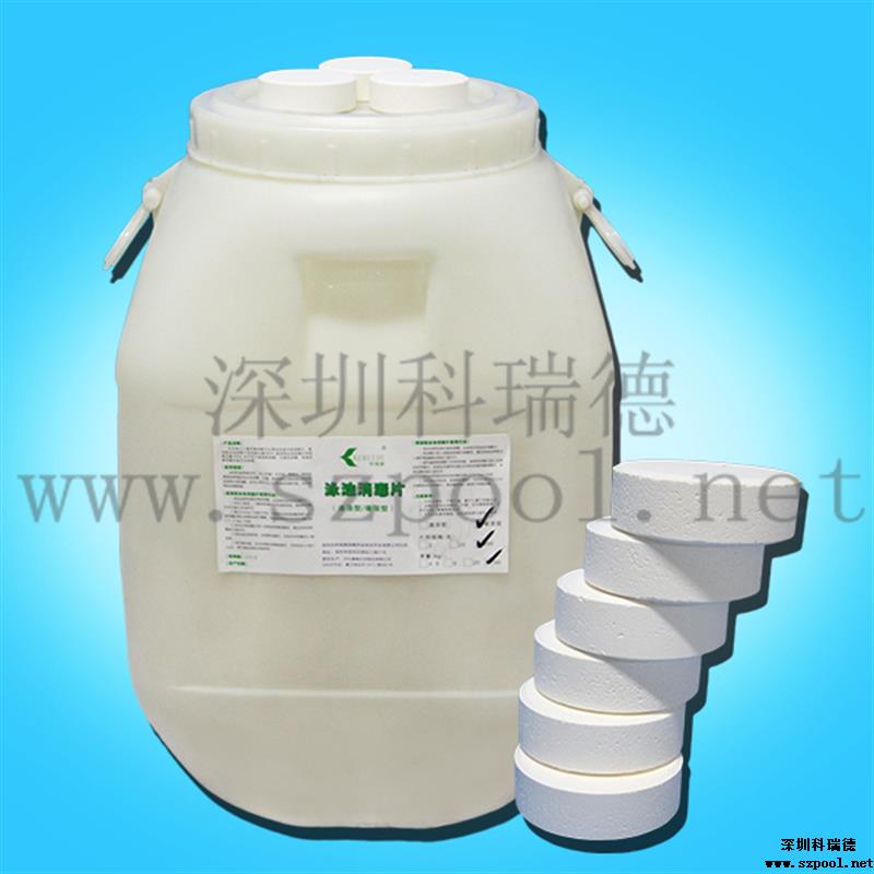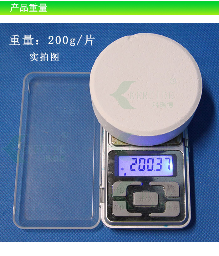 科瑞德緩溶消毒片:是以氯為主要成份的緩溶消毒片,量大可以滅藻,固稱為雙功能消毒片.用于游泳池水體消毒和滅藻,也叫游泳池消毒片。是常用游泳池水處理藥劑。