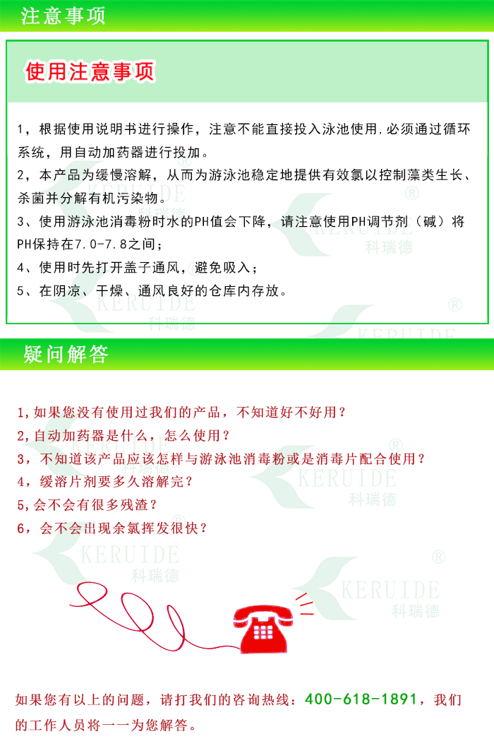 【使用方法】:緩溶消毒片不能直接投入泳池使用,必須使用自動加藥器通過循環系統加入。如沒有自動監控系統控制加藥,則需人工檢測水的余氯,如低于標準則打開投藥器,如高于標準則關閉投藥器。