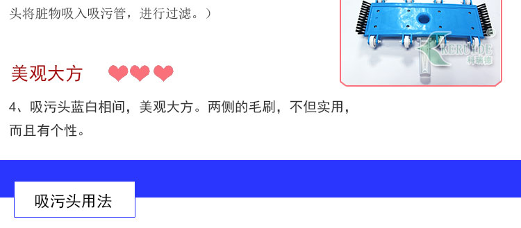 吸污頭:本吸污頭為14英寸帶刷毛塑料吸污頭,配塑料手柄、側面均帶毛刷,吸污時還可以對池底進行刷洗,可以邊吸污邊刷洗池底,操作靈活、方便。