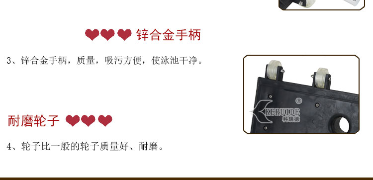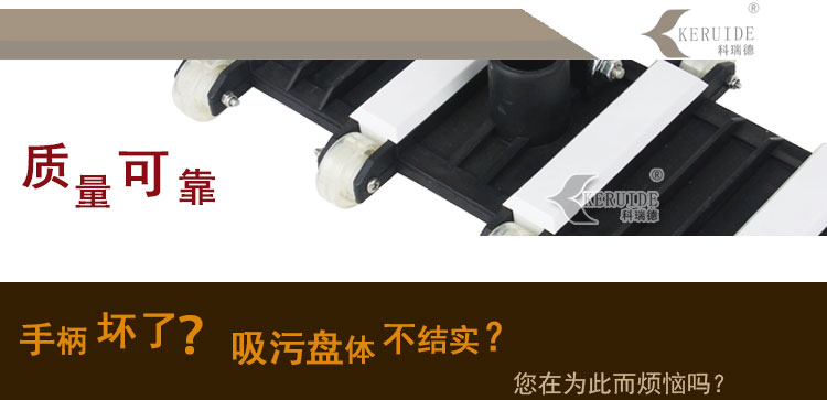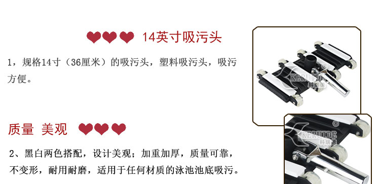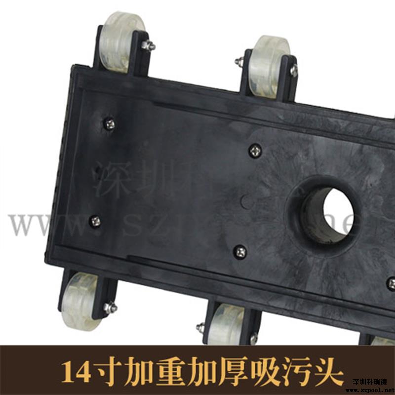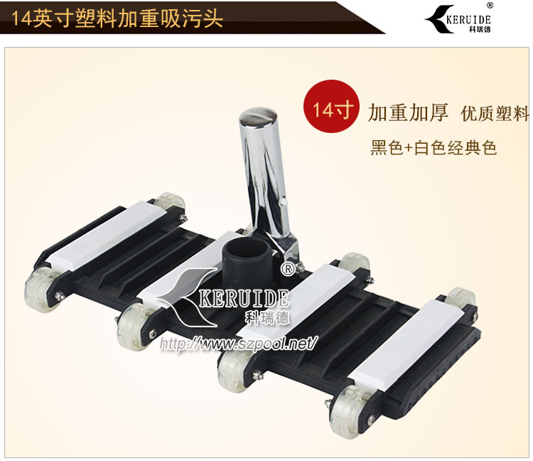 游泳池吸污頭:本吸污頭為14英寸塑料加重吸污頭,帶有鋅合金手柄、聚氨酯料滾珠輪子、ABS吸污管轉換接頭,讓你在吸污時更貼緊池底不易上浮,并且操作更加靈活、方便,質量可靠,耐磨耐用,適合于池底為任何材質的泳池吸污。
