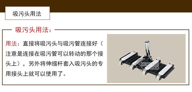 直接將吸污頭與吸污管連接好(注意是連接在吸污管可以轉動的那個接頭上),另外將伸縮桿套入吸污頭的接頭上就可以使用了。