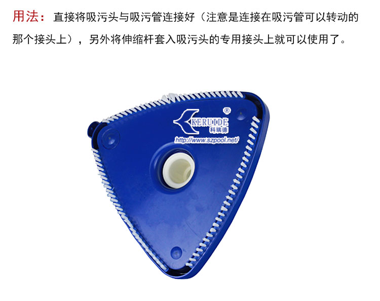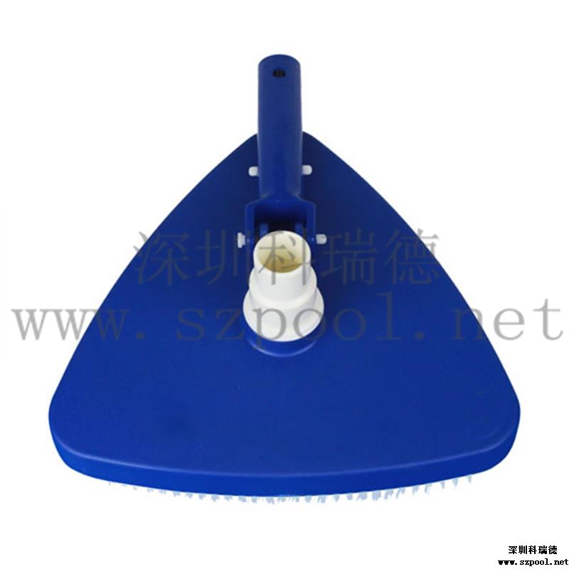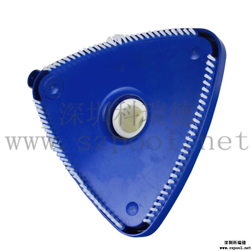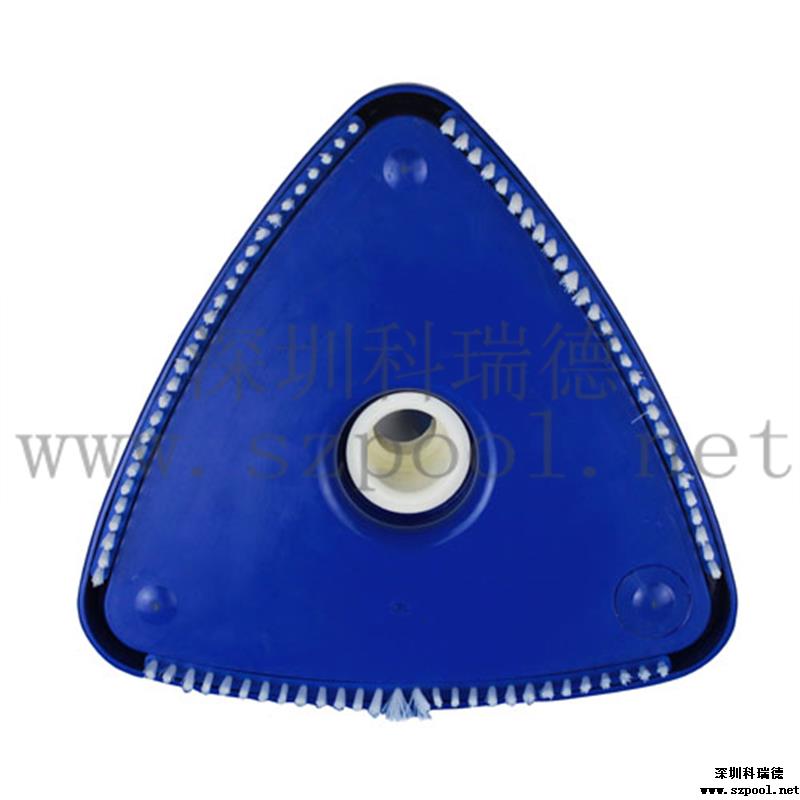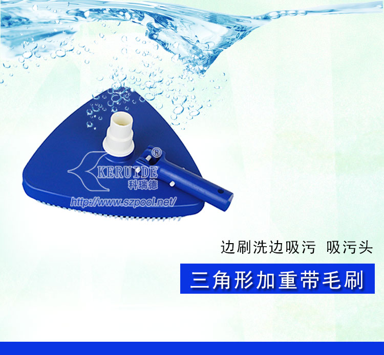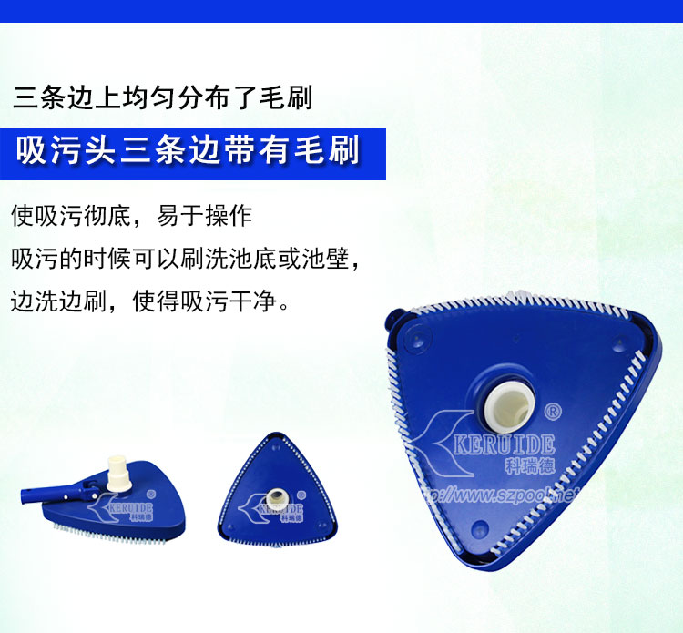 外形美觀,吸污干凈。形狀為圓角三角形。美觀的同時操作方便。其次,吸污效果好,沿著吸污盤三條邊帶有毛刷,吸污的時候可以刷洗池底或池壁,使得吸污干凈。毛刷為塑料毛刷,不會刷壞泳池池壁或池底。帶轉向的手柄可以從上下變換角度控制吸污頭,方便吸污。