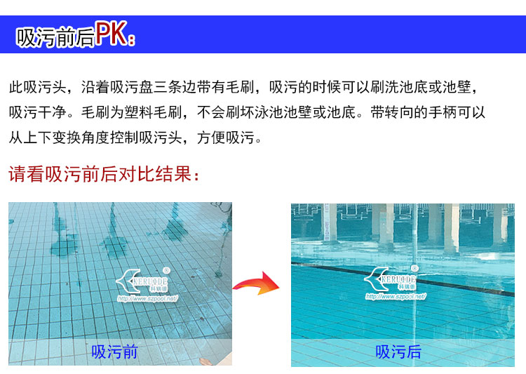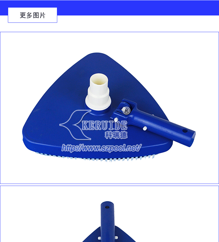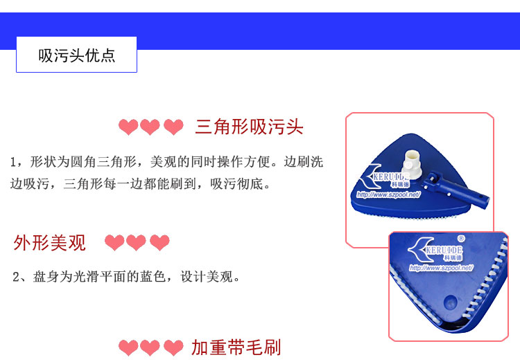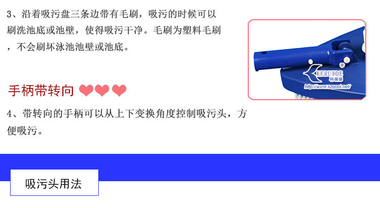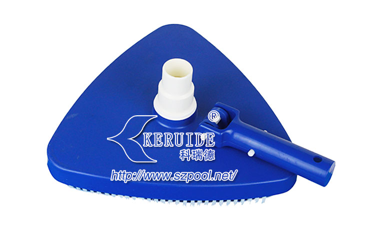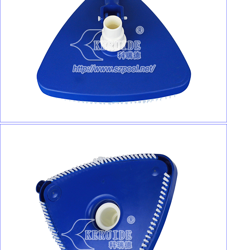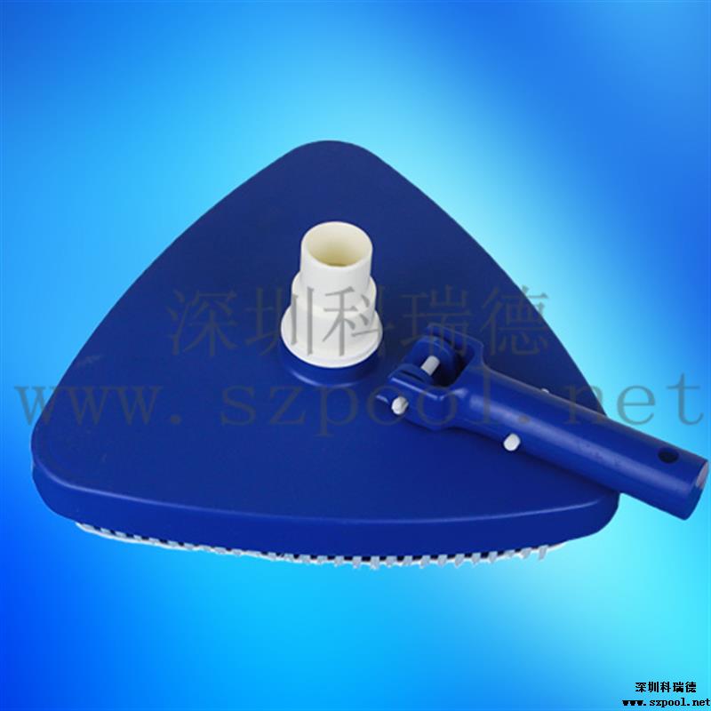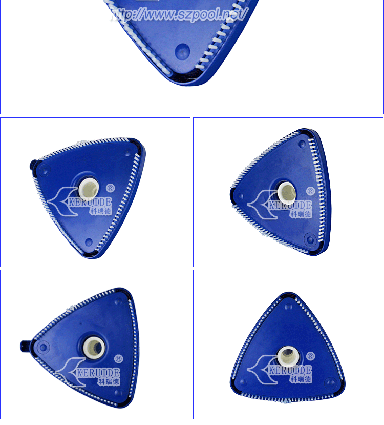外形美觀,吸污干凈。形狀為圓角三角形。美觀的同時操作方便。其次,吸污效果好,沿著吸污盤三條邊帶有毛刷,吸污的時候可以刷洗池底或池壁,使得吸污干凈。毛刷為塑料毛刷,不會刷壞泳池池壁或池底。帶轉向的手柄可以從上下變換角度控制吸污頭,方便吸污。
