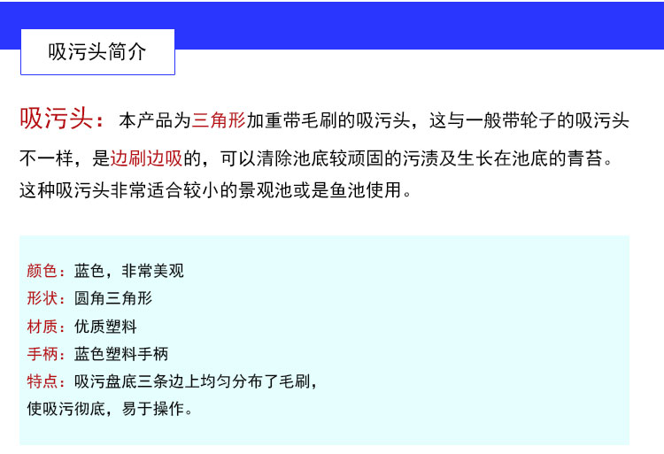 吸污頭:本產品為三角形加重帶毛刷的吸污頭,這與一般帶輪子的吸污頭不一樣,是邊刷邊吸的,可以清潔池底較頑固的污圬及生長在池底的青苔。這種吸污頭適合較小的景觀池或是魚池使用。