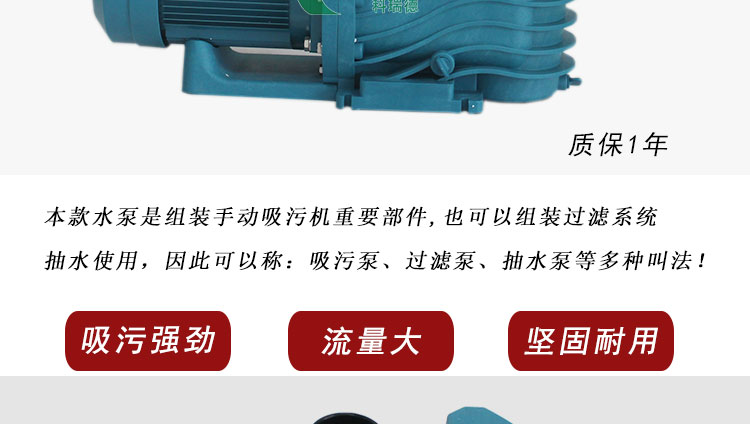愛克吸污泵是游泳池吸污機的主要部件,本吸污泵功率1.5匹,單人操作,流量大吸力強,經濟實用,是目前游泳池手動吸污機組合重要的部件,本款規格適合小型游泳場所選擇,質量可靠(免費保修一年)。