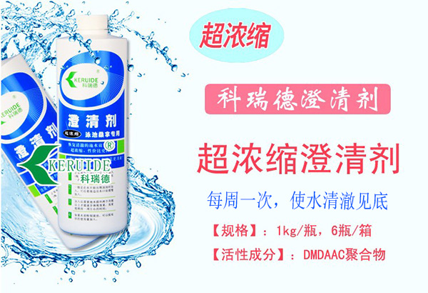 科瑞德澄清劑是一種超濃縮型液體凈水劑陽離子聚合物,規格為1kg/瓶,6瓶/箱,它主要通過陽離子聚合物的吸附將水中的細小雜質形成稍大的微粒,使其隨著水流進入循環系統,通過沙缸過濾使水質變清,能徹底去除水中的雜質,投加后循環過濾系統至少開啟6-8小時,才能使水清澈。