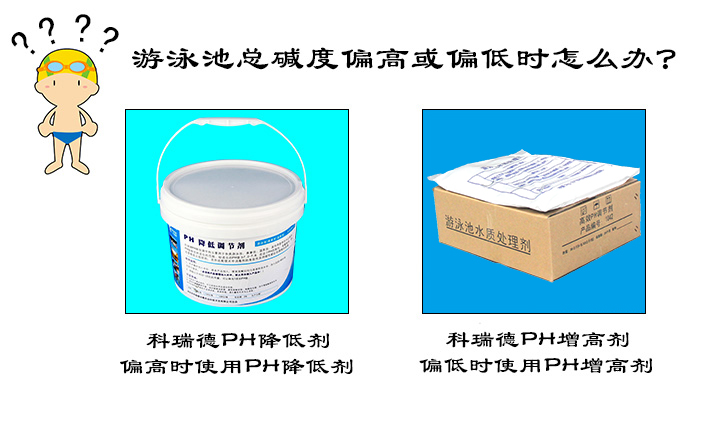 那當游泳池總堿度偏高或偏低時該怎么辦呢?當總堿度偏低時,可使用PH增高劑來調節,即我們常用的碳酸鈉ph增高劑;當總堿度偏高時,可使用PH降低劑來進行調節,即我們常用的科瑞德PH降低劑。需要注意的是,在加入補充藥劑過程中要在局部形成比較高的濃度,這樣才能降低或者增加總堿度,所以需要把pH降低劑或者碳酸鈉一次性加入水中,不要少量多次添加,要一次性投放。(PH值增高或降低的調節機詳情可進入http://www.0937114.com/products/c12.html)