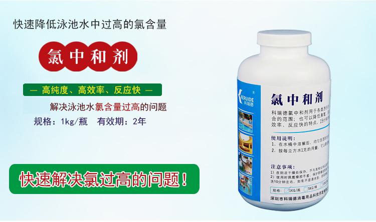 2.如果時間比較緊急,例如有人要來檢查了或者馬上要開館了來不及補水的話,可以使用氯中和劑來進行降低;科瑞德泳池氯中和劑適用于各類游泳池、桑拿池、溫泉池,其作用是將池水過高的氯含量降低到適合的范圍,也可以降低臭氧、溴或各種氧化類沖擊性處理劑的濃度。其產品具有高純度、高效率、反應快的特點,解決氯含量過高的問題。使用方法簡單,在水桶中溶解后,均勻潑灑到池水中即可。1000立方水使用1kg氯中和劑,可以降低3mg/L的氯含量。