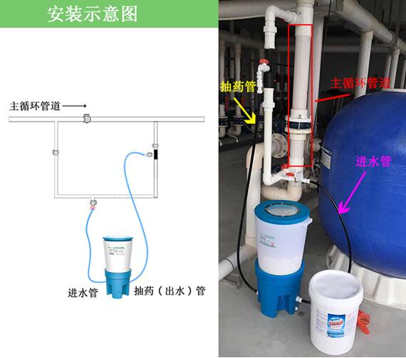 與傳統的加藥桶相比,我們固液分離、即用即溶的方式,避免了一次性浸泡全部消毒片所造成的失效快、氣味重這個重大缺陷;水隔式密封及桶內負壓設計可以使得投藥器密封性更好,并且消毒片溶解時產生的氯味會被抽入泳池循環管道中。使用我們的自動投藥器后,在較密閉的機房內也不會有氯味產生,很好地避免了氯對人體造成的不適,也有效防止了氯對機房設備的腐蝕。此游池自動投藥器在噴淋時只會把底部的藥片進行溶解,上方的藥片不會受到影響,而且在抽藥過程中,會把散發在桶里的氯氣也一并抽到泳池,這就避免了氯氣泄漏腐蝕機房,讓工作人員在整個加藥過程中都聞不到氯味,可輕松地呼吸;也利用了藥劑的價值,不造成浪費,這是人性化的功能。