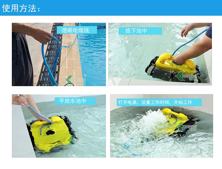 海獅吸污機使用方法: 取出吸污機,理順電纜線,平放到泳池中,插上電源,打開開關,設定工作時間,它便會自己清理泳池,在清潔周期結束后會自動關機。(注:首次使用時請按設定的6個小時讓其運行完一個周期,讓其能記憶泳池的大小,在下次運行時路線更合理。)