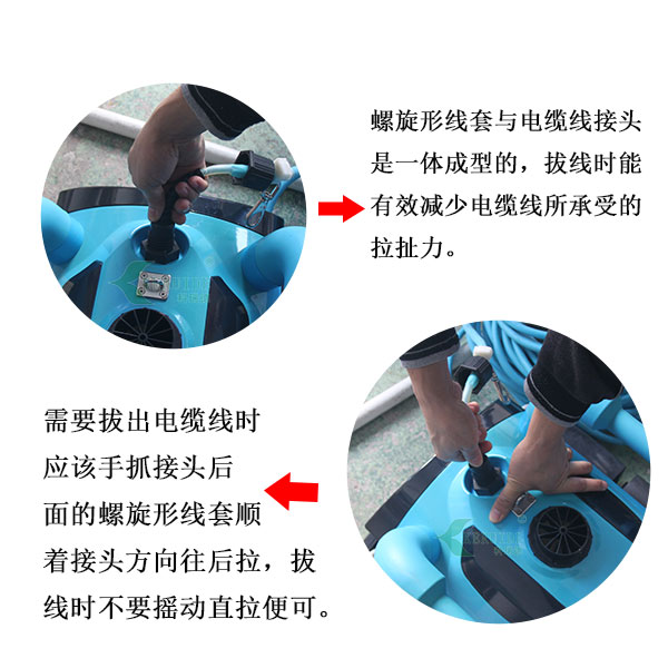 1. 電纜線與吸污機連接頭的保養,電纜線頭與吸污機連接處不適宜使勁頻繁插拔。需要拔出電纜線時應該手抓接頭后面的螺旋形線套順著接頭方向往后拉,拔線時不要搖動直拉便可。(螺旋形線套與電纜線接頭是一體成型的,拔線時能有效減少電纜線所承受的拉扯力。)