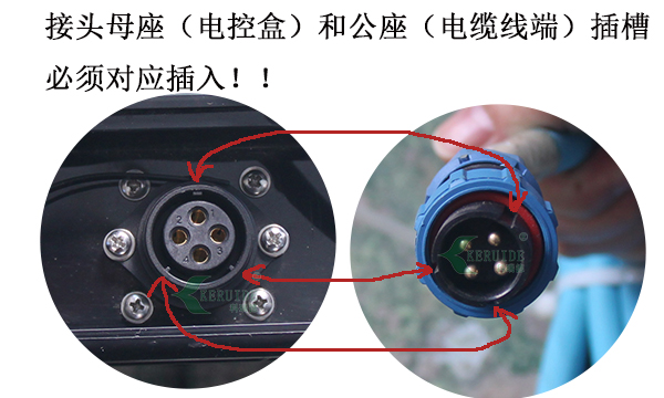 2. 電控盒(電源)與電纜線連接時,接頭的公頭(電纜線端)與母頭(電控盒)的插槽必須對應插入。插線時禁止以插頭旋轉的方式來找到對應的插槽以防接頭插槽磨損導致插錯線而燒壞機器內的電路板。