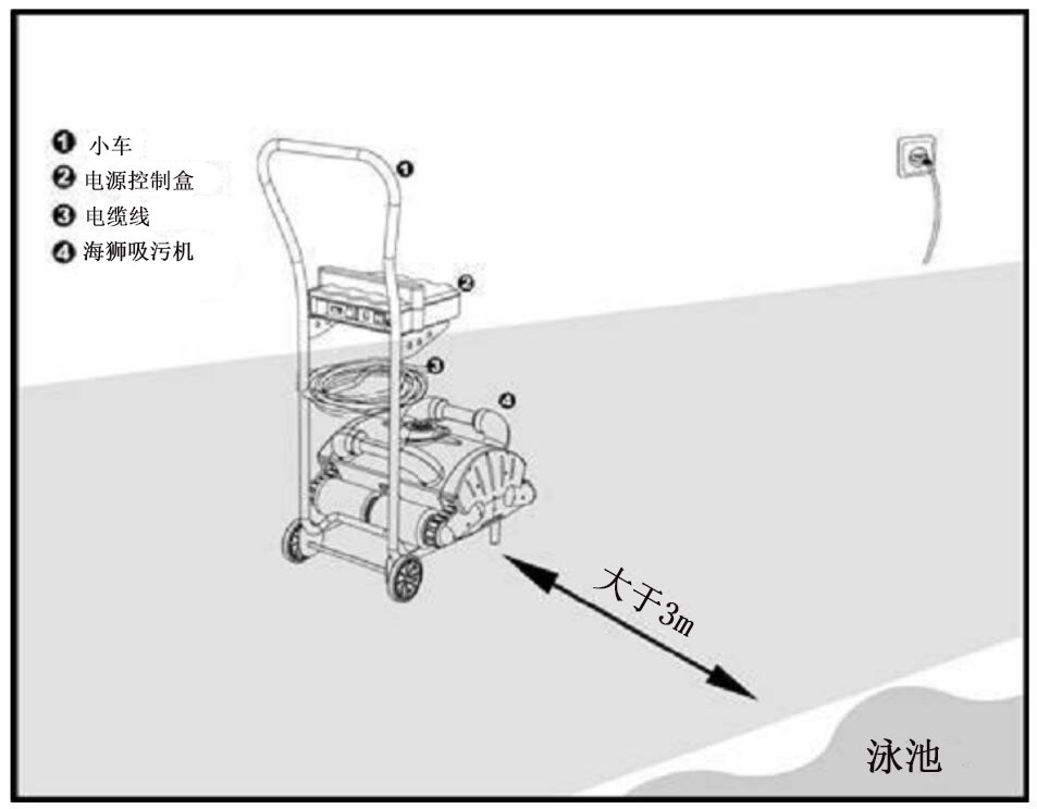 3. 嚴禁電控盒進水,建議將其放置陰涼、通風處、干燥的地方(如遮雨屋檐下,防止日曬雨淋的地方)工作;電控盒距離游泳池邊緣大于3m。