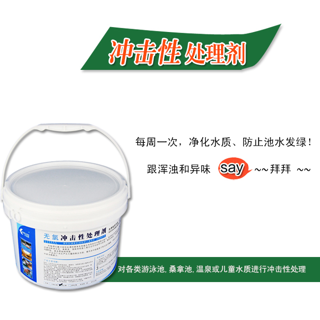 沖擊性處理是一次性加入足夠的氯或沖擊性處理劑,讓其徹底氧分解掉所有的有機物或殺滅泳池里的藻類,加入的量是直到余氯維持在某一濃度下不容易下降為止。